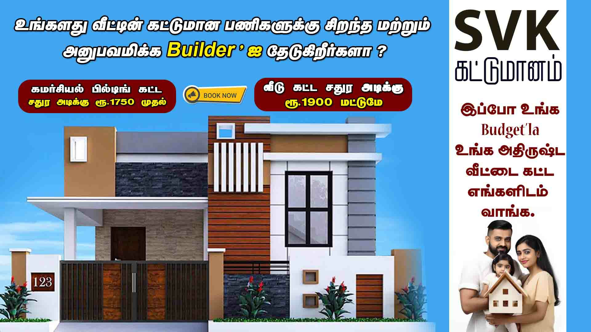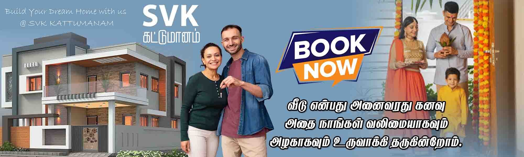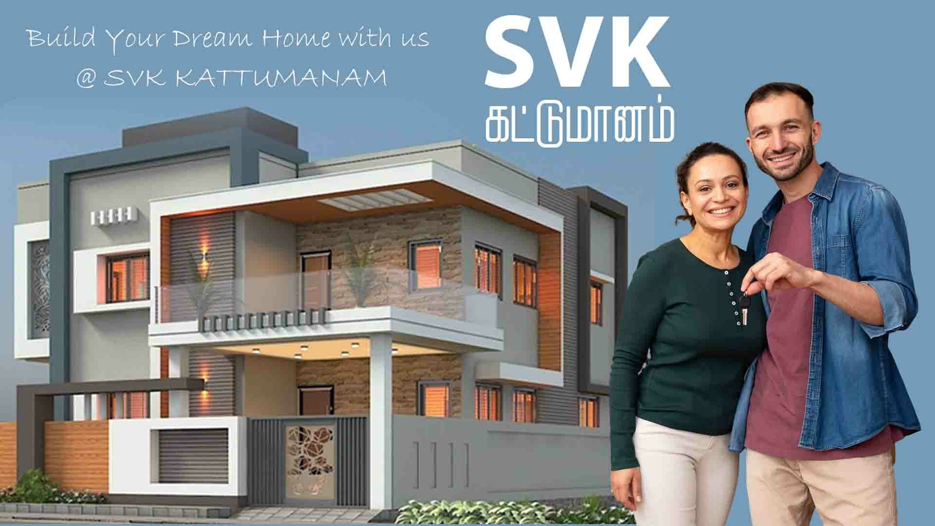 Hello! We are SVK Kattumanam, and we build with care, love, and strong hands. From small homes to big buildings, we make each project safe, strong, and beautiful. Our team works like a family — we listen to your ideas, plan it well, and make it real. We believe every brick tells a story, and we want your story to be happy and lasting. With us, building is not hard… it’s a joy! Let’s make something amazing together.